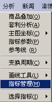 1、进入k线画面,在“菜单条”上选择“分析”,下拉菜单中选择“指标管理”。如图2-7-1