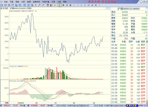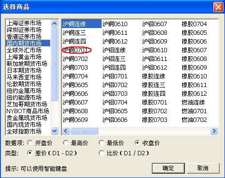 3、 例如,选择沪铜0609商品与沪铜0701商品以收盘价进行差价套利,显示套利。如图2-5-3