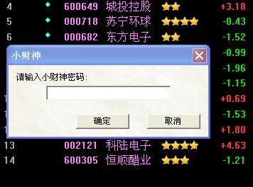 这是因为你设了用户密码保护,小财神密码即是您登录同花顺的登录密码,如果您要取消的话,您在登录小财神后点击“账户”菜单栏,将“用户密码保护”前面的勾去掉即可。