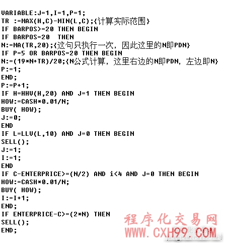 该版本主要的改进之处是在N的算法上直接用语句实现,因为SMA函数首次的N即PDN取值是不海龟交易系统所说的20日简单均线,所以会造成误差,而改进后更符合原意。我们在这里说的N、PDN等等,对假如没看过海龟法则的投资者而言可能无法理解,所以在了解源码之前可以先看看海龟法则。 以下是修正版的程序: