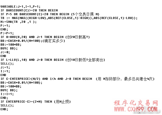 头寸管理和风险控制策略:海龟交易系统由总资金风险百分比和N波动的系数策略来决定交易头寸的多少,用N确定什么时候加仓、加多少,同时用2N来确定头寸的保护性损止。N每7天调整一次(五个交易日)。这就是海龟交易系统的交易策略,属于一套完整的交易系统。下面是我写的海龟交易系统测试版的编程源码。