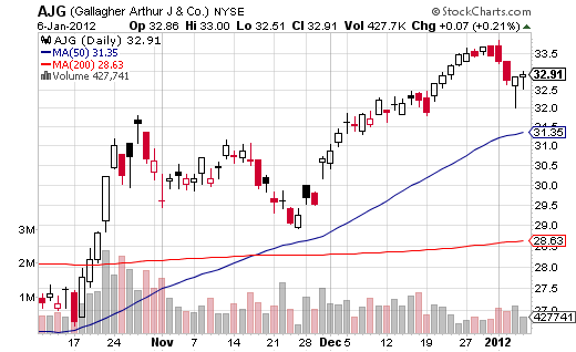 今年已开始在相对 平静的方式与市场不是真的,因为1月3日闭幕的基础上的任何地方。由于SPDR S&P 500指数(方舟:SPY)ETF的范围和严格的价格区域内收敛,个股都出现了更具体的技术信号,为未来的发展方向。锤子烛台模式看起来喜欢顾名思义。经典,它被视为年底达到或接近衰退,并组成一个小型的真身(打开和关闭之间的差异),但有很长的下影线(天低比接近低得多)。这一天的价格模式,显示了市场情绪的逆转,部队负有质疑他们的立场,并提供一些看好的公牛。这四只股票都看到,在过去的几天锤子烛台模式,这可能意味着进一步上涨,因为这些股票可能已经敲定了一个短期的底部。Investopedia市场:探索最好的一站式金融新闻源,报价和见解。阿瑟·J加拉格尔公司(纽约证券交易所:AJG)周四上创建一个大锤子烛台。该股开盘32.60美元,下跌至$ 32.01,然后积极上涨,收于$ 32.84(只有两美分,脱离日高)。这一举措显示了从公牛队被定罪后,最近股市下跌34美元至32美元。锤往往与一个转折点,因此,提出了一种潜在的买入机会。可以购买附近的日高,或者等待一拉向32元(这可能会或可能不会发生)。止损可以放在位低于32美元。52周新高 33.99美元,因此,如果这股走高,它需要打破该级别。如果确实如此,最初的目标是36美元。