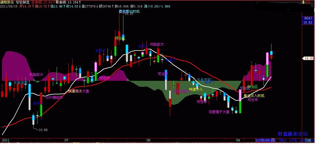 精品主图指标-智能解盘优化 (主图、源码、贴图、说明、公式文件)在实战交流区地主会中发了个主图,只是在原图的基础上加了MACD,优化了一下,在飞狐软件中用觉得不错,给大家分享下。