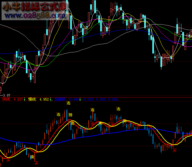 慢线:EMA(ref(快线,1),3),LINETHICK2,COLOR00FFFF;