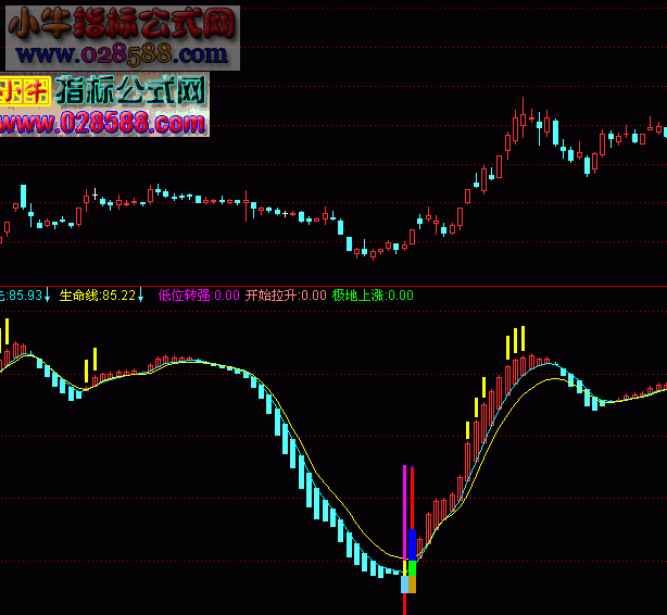 STICKLINE((低位转强>0)OR(极地上涨>0),15,低位转强*0.4,3,0),COLORYELLOW;