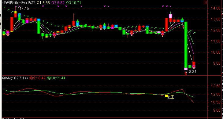当满足条件84上穿VAR7时,在最高价*1.01位置书写文字,画绿色