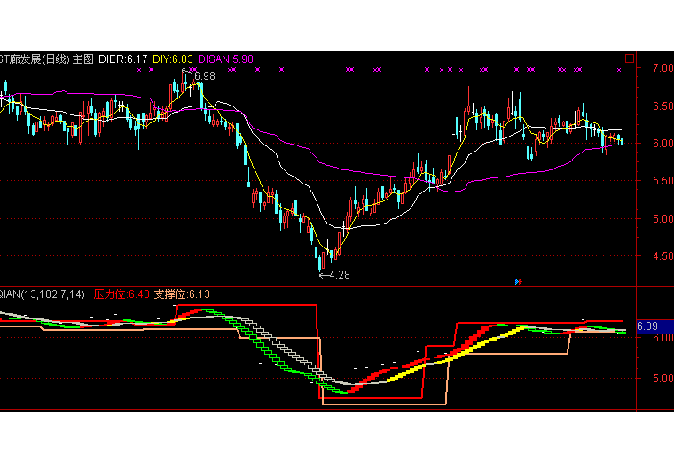 输出支撑位:如果J上穿J24,返回最低价,否则返回上次J上穿J24距今天数日前的最低价,COLOR77AAFF,,线宽为2