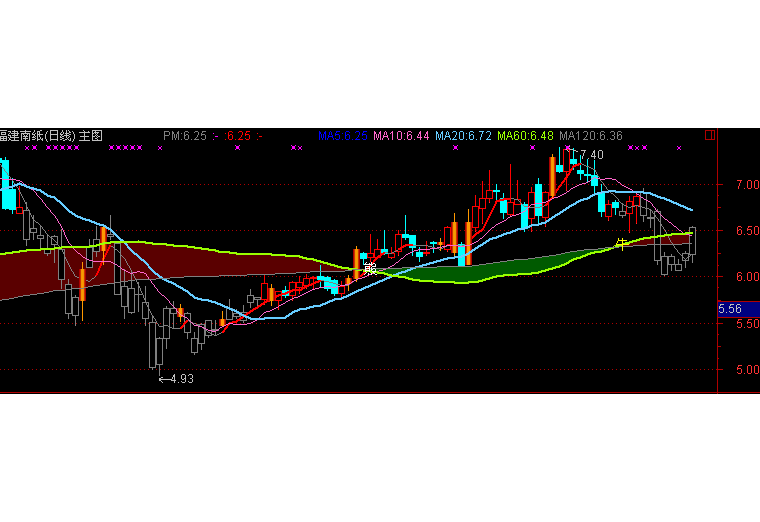 当满足条件MA60上穿MA120时,在MA60位置书写文字,画黄色,线宽为4