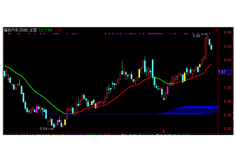 EE赋值:A<B AND 收盘价>A AND 收盘价上穿收盘价的8日简单移动平均