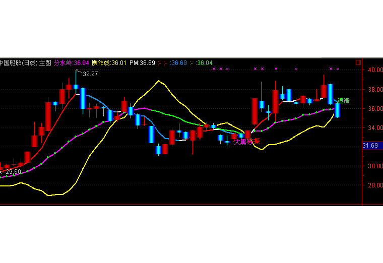 输出操作线:分水岭-(收盘价的3日指数移动平均-分水岭),COLOR00FFFF,线宽为2