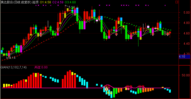 当满足条件关注上穿4.5时,在关注位置书写文字,COLOR0000FF