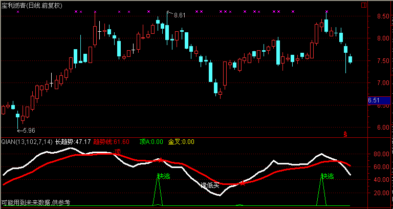 逢低买: DRAWTEXT(REF(CROSS(趋势线,长趋势),82) AND 趋势线>1.3*长趋势,长趋势,'逢低买'),LINETHICK1;