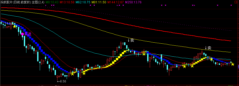 输出M13:M8的13日指数移动平均,COLOR0000FF