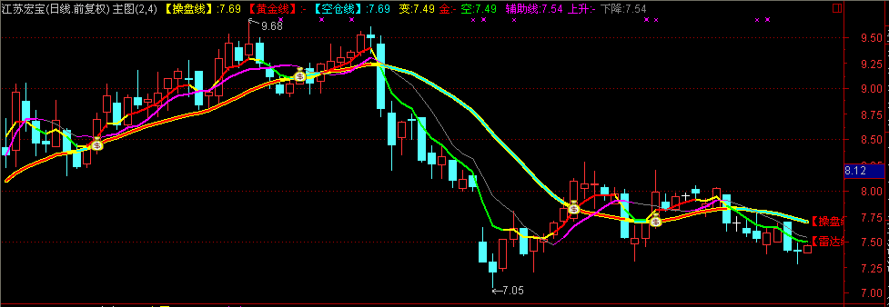 DA赋值:(最高价的1日指数移动平均+最低价的1日指数移动平均+最高价的1日指数移动平均+最高价的1日指数移动平均)/4,线宽为2