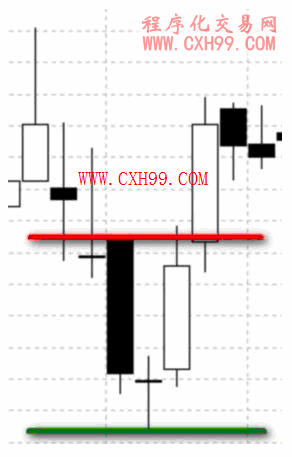 这是一个十字晨星的图形。我们一般的介入点应该是在红线位置,当价格被确认突破左边的阴线实体。但是偷鸡是必须要一把米的不是吗?我们的停损单必须挂在绿色线位置十字线的低点被突破,这就是我们如果要使用十字晨星这个讯号来交易所必须付出的交易成本;属于技术工具的部份。而在实际的交易中,你比较少的机会会执行在标准的红在线头,当然是落在那根突破阳线的任何一个价格,但一般是高于红线的。在加上手续费、整体的进场成本是绝对高于理想的红线的。