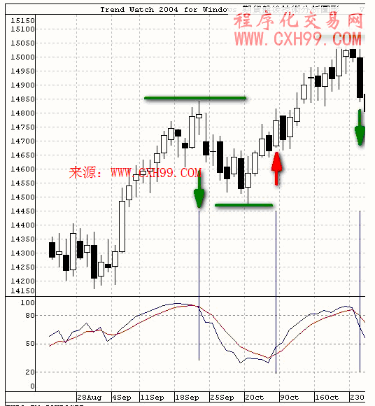 进场讯号是当4天交叉过9天向上,我们的停损是决定两种状况被产生时的二择一;当绿色的明显低点被跌破或4天的移动平均跌破9天。红箭头代表买进,而绿箭头代表卖出平仓。这些没标示前看似不错的交易机会,当我们认真看待时就会发现相对于付出的成本,它实在必须我们在决定交易前有所思量。那我们喜欢玩的技术指标又是如何看待成本的呢?特别是一般喜欢使用的Cross Over、Under 之类的情形。
