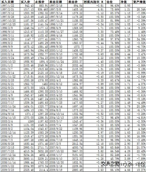若用这个交易系统对1997年1月1日到2009年6月19日的上证指数进行模拟交易,我们将得到如下的交易数据: