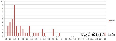 45比交易中,一共有21比交易最终收益为正,24比交易收益为负。虽然,看上去交易的成功率比随机数50%还要低,但是作为趋势投资,这已经是很好的结果了。其实如果采用随机入市,交易的结果是达不到50%的。原因是有一部分本来应该是成功的交易,最终在止损位提前止步,最后变为了亏损的交易。当然,这也是趋势交易必须要付出的代价。