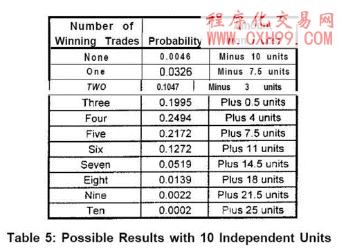 可是如果我们拿著这套系统,去同时交易10个彼此”独立”的商品。这裡所谓的”独立”是指这些商品的走势不会彼此互相影响。这样的话,我们每个月就会有10笔交易的产生,而下面这个表则列出了每个月的10笔交易不同输赢的结果,可能发生的机率。