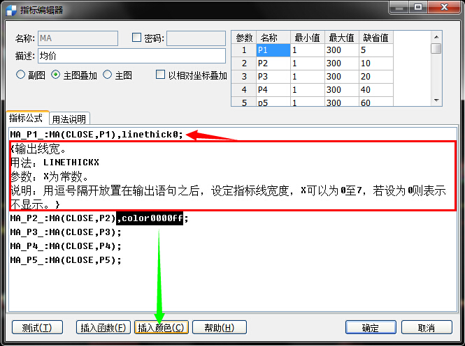 1、不想显示某条均线,可直接删语句。但如果只是不想看到画线,可以将其输出线宽设置成0;(图中红箭头)