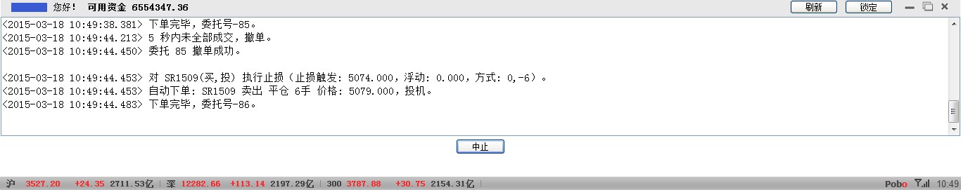 这是因为根据软件的默认设置,在止损止盈触发发出委托的5秒后,委托仍未全部成交,软件会自动将未成交的委托撤回,并重新按照当时的对手价发出委托,同时显示“中止”界面,告知用户首次下单未能全部成交,软件正在进行撤单和重发委托的操作(如图一)。 图一