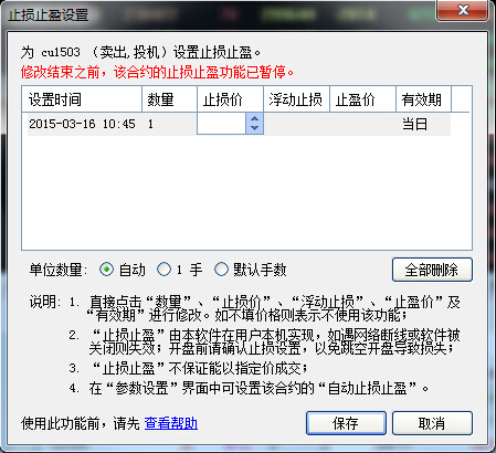 该提示语句显示在止损止盈设置窗口中(如下图),是指窗口打开期间该合约止损止盈设置暂时失效,窗口关闭后可生效。具体来说,就是在这个设置窗口打开期间,即使行情达到止损止盈的触发条件也不会触发,只有设置完止损止盈或修改好止损止盈后,点击“保存”按钮,关闭了这个窗口,此时止损止盈才开始生效。