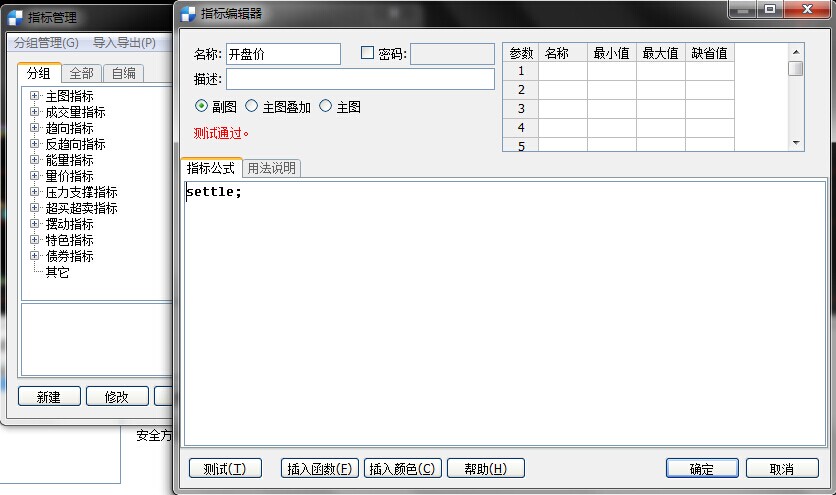 您在K线页面上点击右键技术分析,指标管理,点击新建,之后您新建一个指标函数,您点击下面的插入函数点击左边的行情,右边会出现相应的函数公式。如图:1是结算价指标,图2是开盘价指标