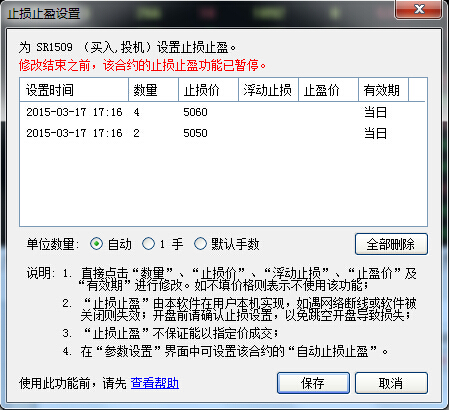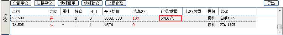 当同一持仓设置了不同的止损止盈价时,持仓界面会显示最容易触发的止损止盈价格和对应的手数。例如,持有白糖1509合约6手,最新价为5070,对其中4手持仓设置止损价为5060,另外2手设置止损价为5050(见图一),则持仓界面显示最容易触发的止损价5060,对应手数为4手(见图二)。