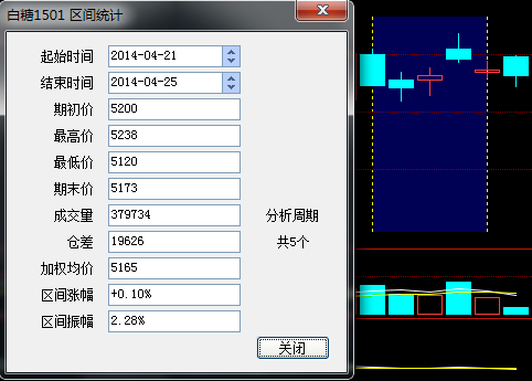 博易技术人员: 区间统计功能 中相关项目算法区间涨幅=(期末价 — 起始日的结算价)/ 起始日的结算价 * 100%区间振幅=(最高价 — 最低价)/ 起始日的收盘价 * 100%注:结算价可以用SETTLE函数求得。