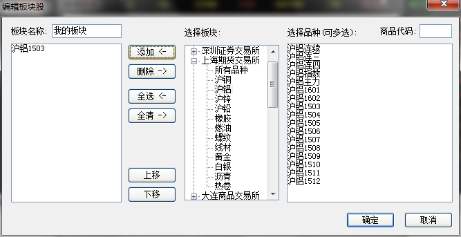 此时会出现各个交易所,我这里选择上海期货交易所,选择沪铝,我这里选择沪铝1503,点击中间的添加会在左边显示出来,点击确定表示这个合约就已经添加到我们的板块了。