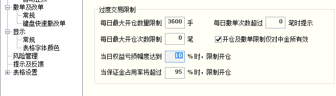我是职业做股指期货日内交易的,由于行情活跃程度不动,其实每天所需的资金是不一样的,但频繁出入金又麻烦,所以一般账户上的资金都大于实际需求。但这样带来一个问题,当做得不好的时候,反而会增加资金使用率,导致日亏损严重。所以我想咨询一下,有没有可能在参数设置里面增加一个风险控制板块,能够根据当日盈亏限制开单数量。比如亏损超过5%,新开单只能使用保证金的80%,亏损超过10%,新开单只能使用保证金的50%等等。国泰君安期货的快期交易终端有类似的功能(如图)。但它开发的初衷可能是为了限制总开单手数,因为以前中金所规定一个账号一天最多只能开1200手(再之前是500手,现在是3600)手,像我这种交易频繁的,以前经常接到期货公司即将达到手数上线的提醒电话,这个功能可以自己控制交易数量。由于这种属于个性化需求,如果软件升级无法满足,你们能不能提供个性化订制服务?如果费用恰当,我也会考虑!博易技术人员: