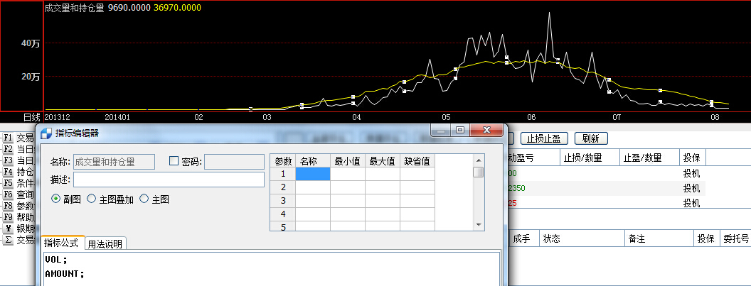 强烈要求vol指标与OI指标合并成一个指标博易技术人员: 可以新建一个指标,新建指标方式:在K线图空白处右击,技术分析——指标管理——新建,输入指标名称,在指标公示栏输入公式:VOL;AMOUNT; 点击确定。调用该指标时,在K线图空白处右击,技术分析——其他,选择该指标。
