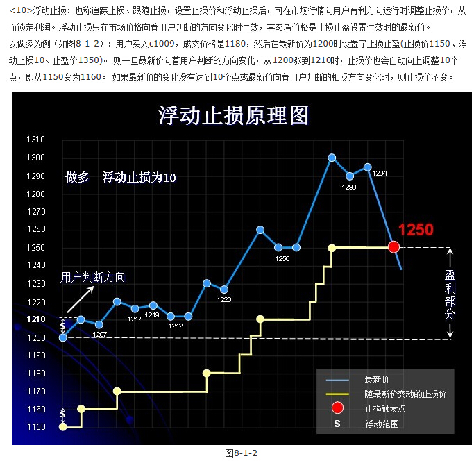 您好,您可以登陆闪电手,在左侧的帮助及说明里,打开闪电手使用说明,在止损止盈里可以找到浮动止损的定义,下面是浮动止损的截图。