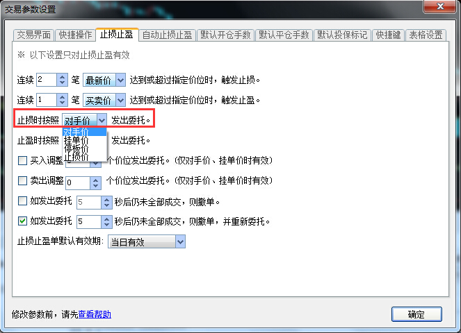 博易技术人员: 点击“F8参数设置——止损止盈”,第三行设置为止损触发后默认的下单价格(如下图),软件默认止损触发后以**对手价**下单。您可以根据需要将“对手价”修改为“挂单价”、“停板价”或“止损价”,修改后点击右下角“确定”按钮即可。