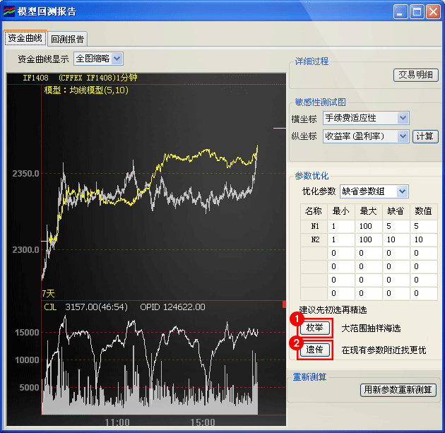 我们会发现在一段时间内表现很好的模型,过了一段时间就好像失效了一样,这种情况可能是由于模型参数不再适应当前市场行情引起的,我们需要统计历史数据寻找新的最优参数,但单凭人工计算几乎是不能的。利用“参数优化”功能,可在指定的范围内让计算机筛选出最适合当前行情的参数。 如下图所示:通过①【枚举】按钮,进行大范围海选抽样。通过②【遗传】按钮,在已经筛选的优质参数附近寻找更优的参数。参数优化原理,请参数说明书“参数优化让模型达到最优”。 |