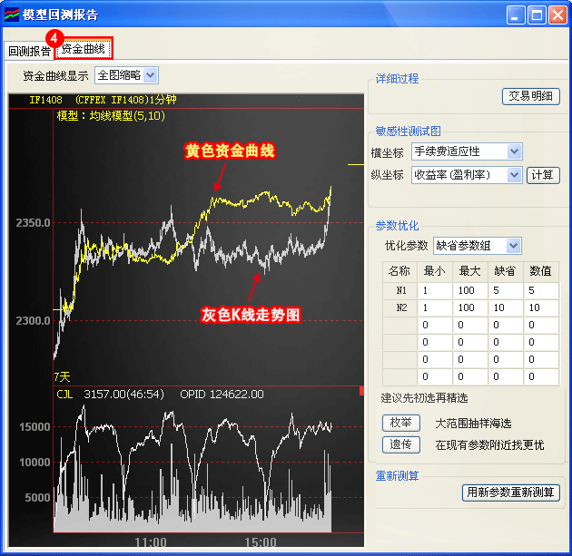 点击下图④处的【资金曲线】,可非常直观的看资金曲线的变化情况,从而去检查模型的效果是否符合我们的预期要求。 |