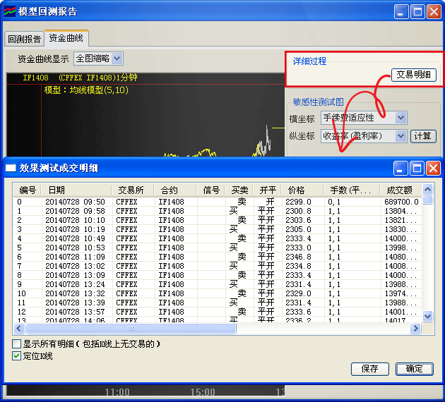 资金最大回撤发生在哪一根K线?出现资金最大回撤时的几笔交易的盈亏都是多少?模型测试的每笔交易的时间和价格具体是多少?这一系列问题都可在“交易明细”中找到答案。交易明细以表格的形式给出了模型完整的成交明细,让我们深度了解模型。 如下图红框位置所示:通过【交易明细】按钮,查看详细的效果测试成交明细。 |