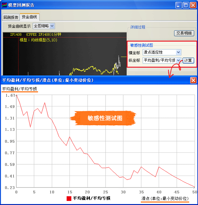 两个盈亏比相同的模型,滑点对盈亏比影响小的那一个,显然是更优的模型。而敏感性测试图能以滑点和平均盈利/平均亏损为横、纵坐标,用线的形式直观显示出滑点变化对平均盈亏的影响,帮助我们找到更好的模型。除了以滑点和平均盈利/平均亏损为横纵坐标外,还可显示以手续费和收益率、开仓手数和平仓盈亏等多种参数为横纵坐标的测试图,从各个方面测试模型的敏感度。 如下图红框位置所示:选择横坐标和纵坐标要考量的变量后,点击【计算】按钮查看敏感性测试图。 |