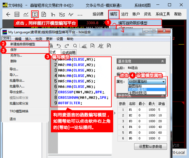 做程序化自动交易,首先要有模型(注:这里提到的模型是指在编辑平台上使用麦语言编写的包含变量、交易条件、交易指令等的源码),程序化会按照模型编写的条件执行。