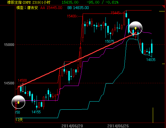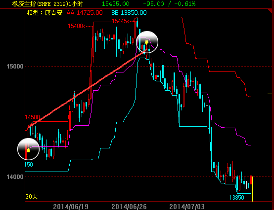 | 唐吉安通道是一个经典的趋势策略,其核心是三条轨道线,即上轨、中轨和下轨,我们可使用麦语言按照唐吉安通道的思想编写出一套趋势追踪的策略模型。下图中,AA、BB、DD分别是唐吉安通道的上中下轨道,在行情上行于中轨和上轨之间时,模型会自动监测并发出做多信号。 |