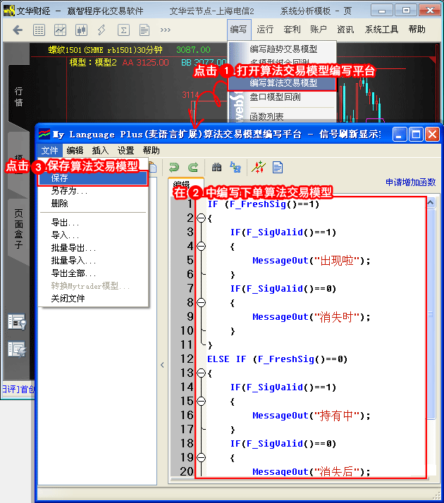 答:如下图所示,点击软件上方菜单的【编写】—>编写算法交易模型,在弹出的窗口中点击【帮助】—>基本语法,即可弹出算法交易模型编写语法的网页。