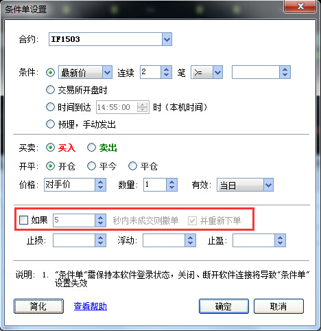 在设置条件单时,勾选“如果5秒内未成交则撤单并重新下单”的选项,点击“确定”可启用追价功能(如下图)。追价功能是指,当条件单触发发出委托的5秒后,委托仍未全部成交,软件会自动将未成交的委托撤回,并重新按照当时的对手价或挂单价发出委托的功能。