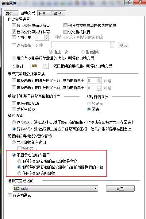 关于经纪商部位、图表部位、策略部位的帖子预计本周结束会发在论坛上,到时可以学习一下!策略属性-自动交易栏位关于“设置经纪商初始的留仓部位”这个设置一直意思不明确,有误解的地方,后期版本会更正,下面简单叙述一下,更详细的请看后面的帖子!