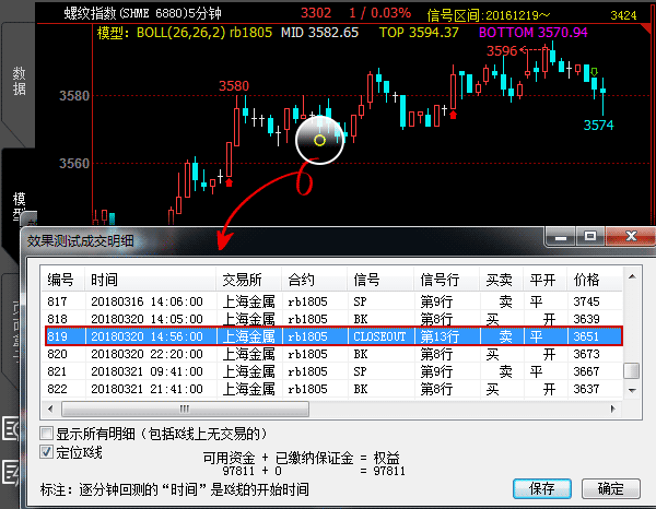 如下图,在收盘价模型中写入提前4分钟走完的语句,模型便会在收盘前4分钟提前执行信号下单,及时出场锁住当天利润。