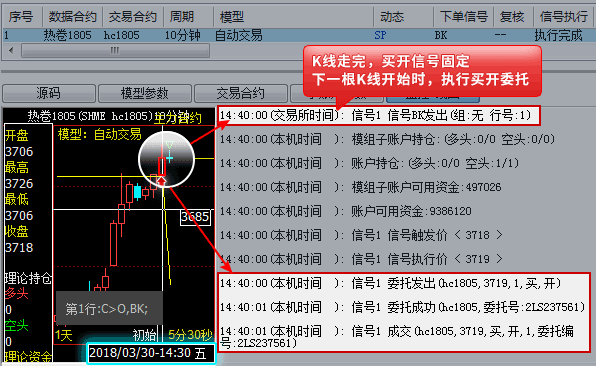 如下图,是一个10分钟周期收盘价模型的执行过程。在14:38:50时,K线上就满足了开仓信号,但此时K线没有走完信号还未固定,所以不进行委托;当K线走完时信号固定,则在新K线刚形成时执行委托。