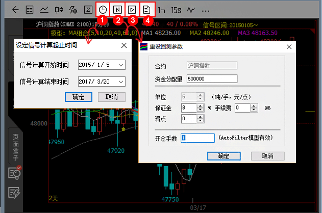 :使用新参数重新回测按钮,当修改回测参数,如起止时间、初始资金等时,点击该按钮,会按照新参数对模型进行回测。测试进行时点击该按钮可以暂停测试。