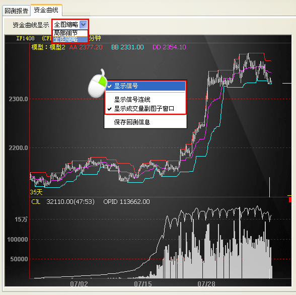 局部细节:显示模型的局部细节信息,在“回测“的k线图上单击鼠标右键,可在这两种模式下设置显示信号、显示信号连线。。