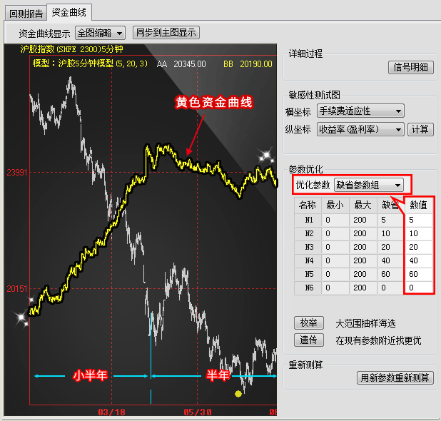 下图是利用参数优化对模型的参数进行枚举和遗传后的结果,在使用新参数后,黄色资金曲线更平滑稳定,新的参数更能适应市场行情,使模型真正达到顺势而为的效果。