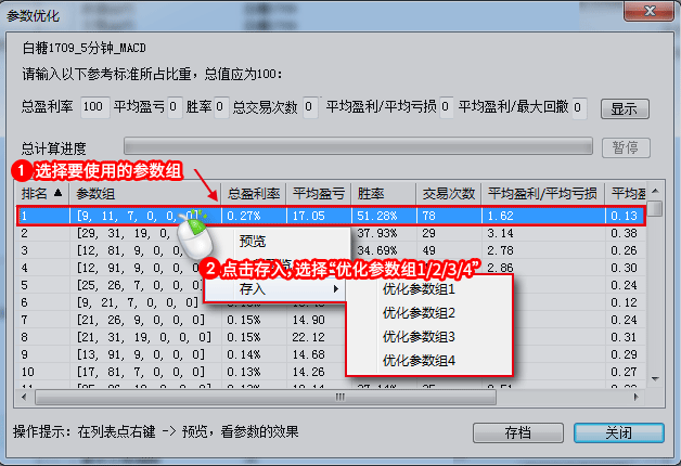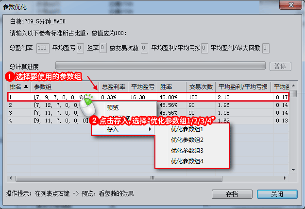 (2)参数优化计算完会以排序的方式显示优化出来参数组(如下图所示),按照下图步骤完成参数组的保存后,点击“关闭”按钮即可。
