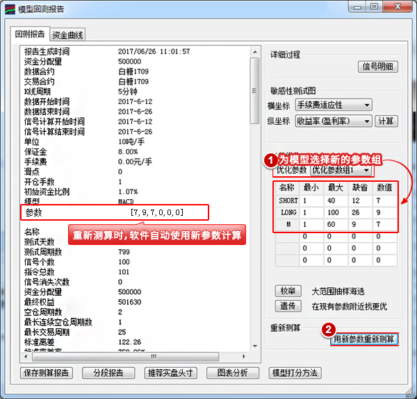 (6)如下图,选择保存好的“优化参数组1/2/3/4”,点击【用新参数重新测算】,新的参数组计算的结果就会显示在“分析报告”中了。{来源 www.cxh99.com }